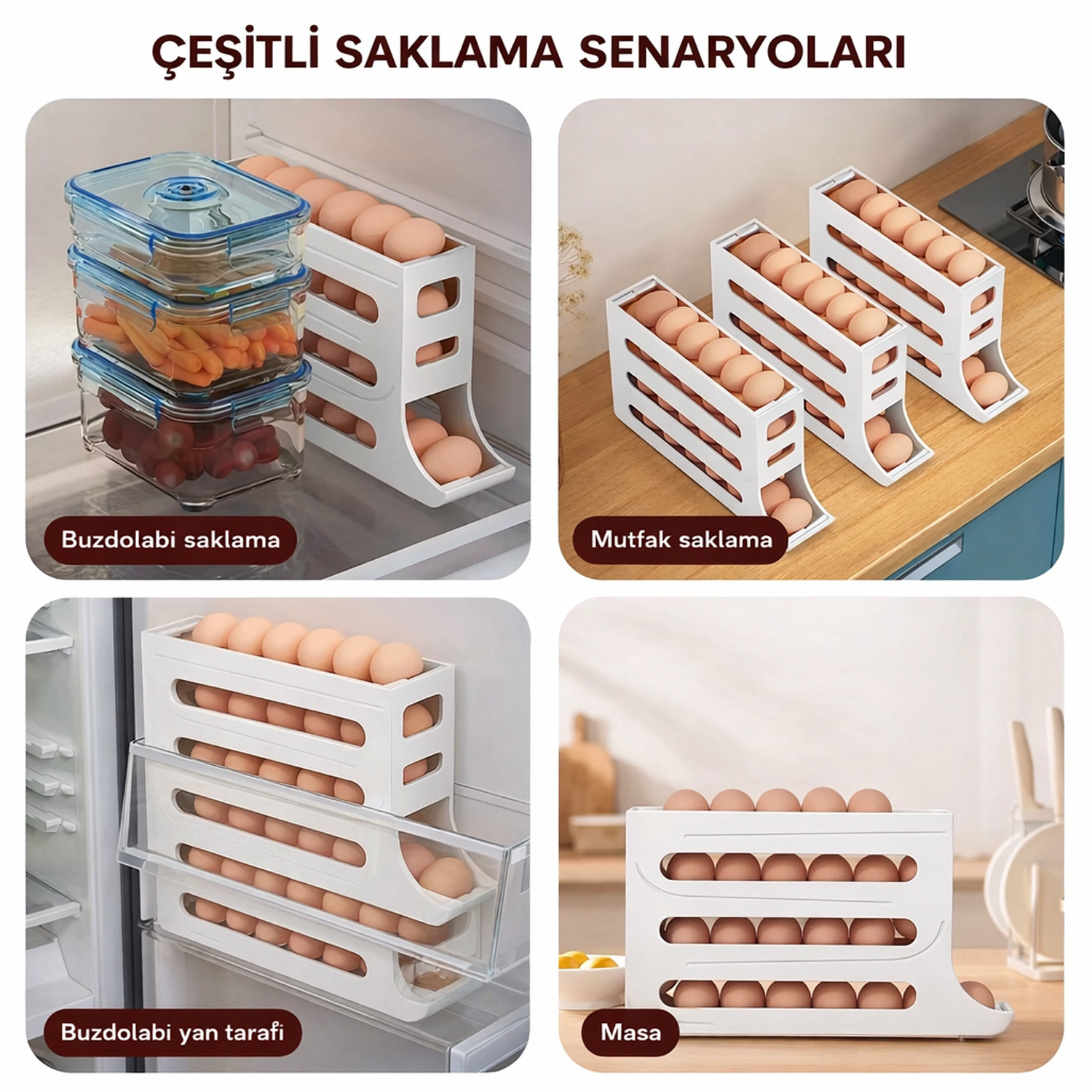 Çok katmanlı yerleşim yapısı ile farklı miktarda yumurtayı düzenli şekilde saklama imkanı verir