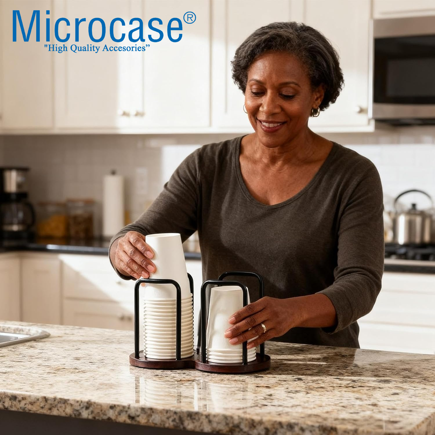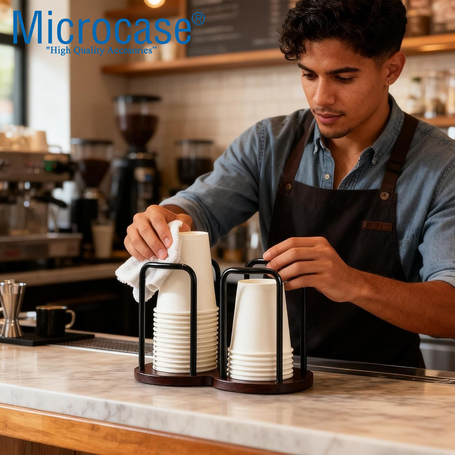 Microcase ikili bardak tutucu, tek kullanımlık bardakları düzenli şekilde istifleyip servis alanınızı toparlar.