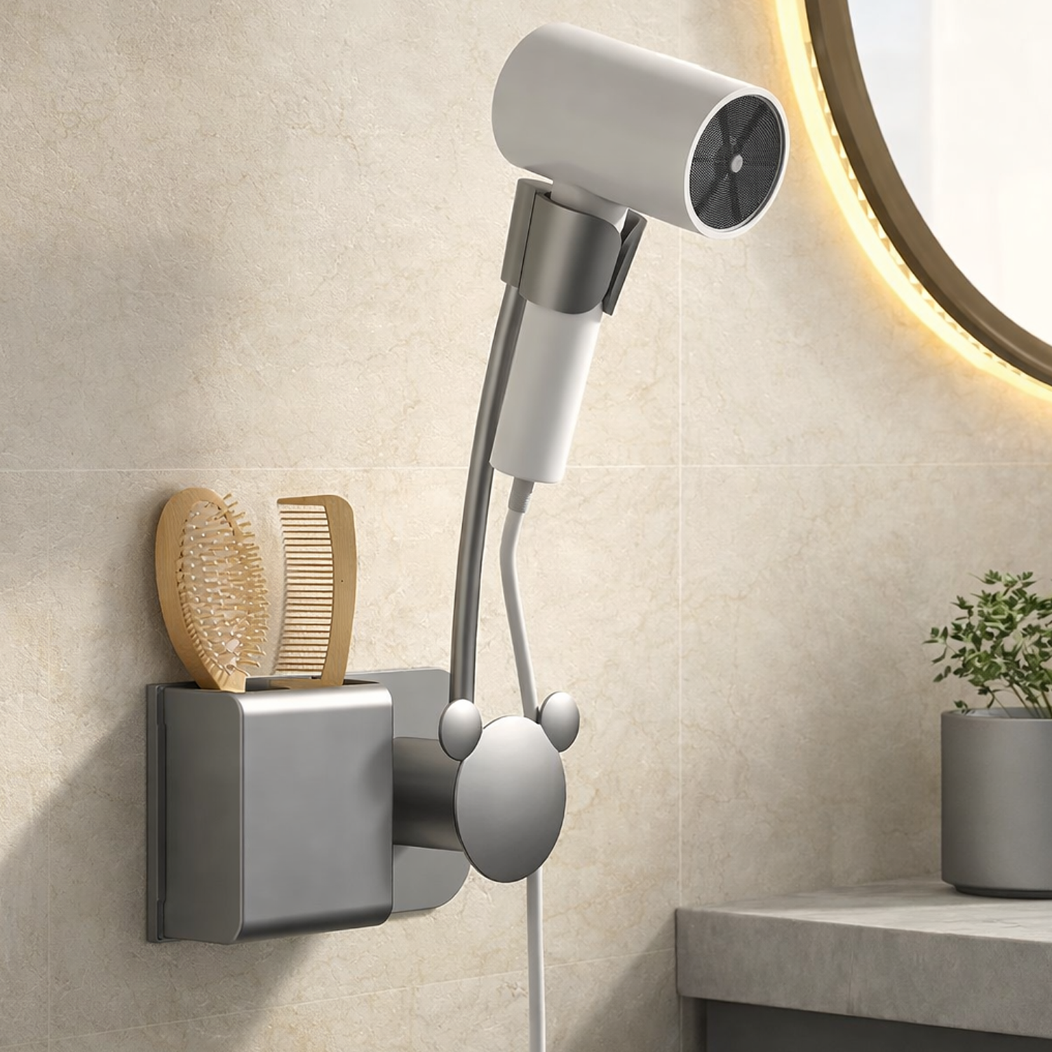 Duvara monte saç kurutma makinesi tutucu ve organizer tasarımına sahiptir